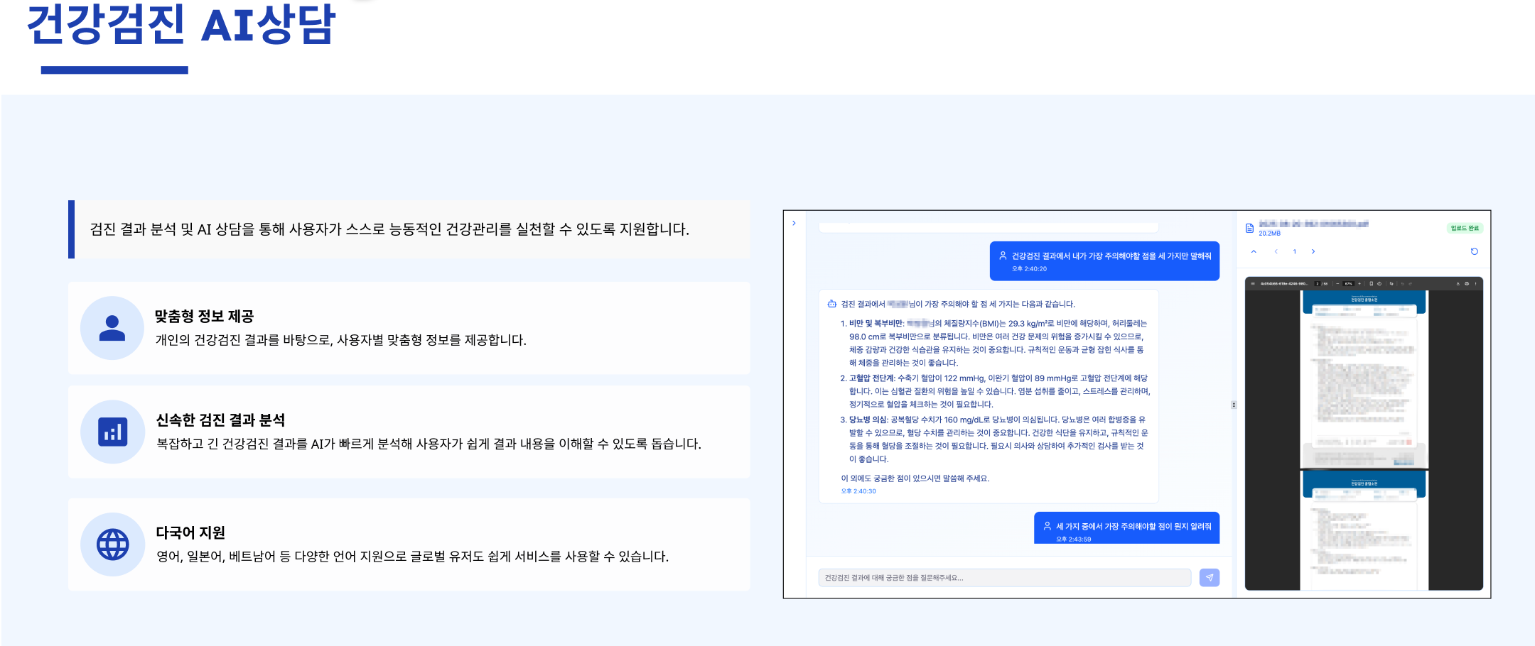 건강검진 결과를 분석하여 요약 및 맞춤 정보를 제공하는 AI 상담 서비스